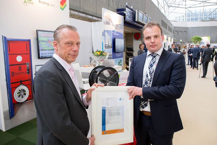 Op 22 maart jl. ontving BuildingLabel het eerste SKG-IKOB KOMO-certificaat voor het uitvoeren van luchtdichtheidsmetingen. Op de vakbeurs Building Holland overhandigde Remco Kruit, certificatiemanager van SKG-IKOB Certificatie, het certificaat aan Maurits Lavèn, directeur van BuildingLabel.