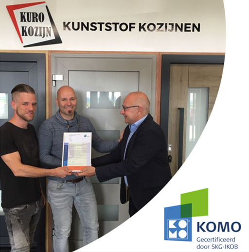De aantoonbaarheid van de kwaliteit van bouwproducten wordt in het kader van de Wet kwaliteitsborging bouwen (Wkb) steeds belangrijker. De firma KURO Kozijn BV te Etten heeft aangetoond het productieproces van kunststof ramen en deuren goed te beheersen en daarom ontvingen Dion Wissing en Remko Roes uit handen van onze collega Guido Soontiëns het KOMO-certificaat op BRL 0703.